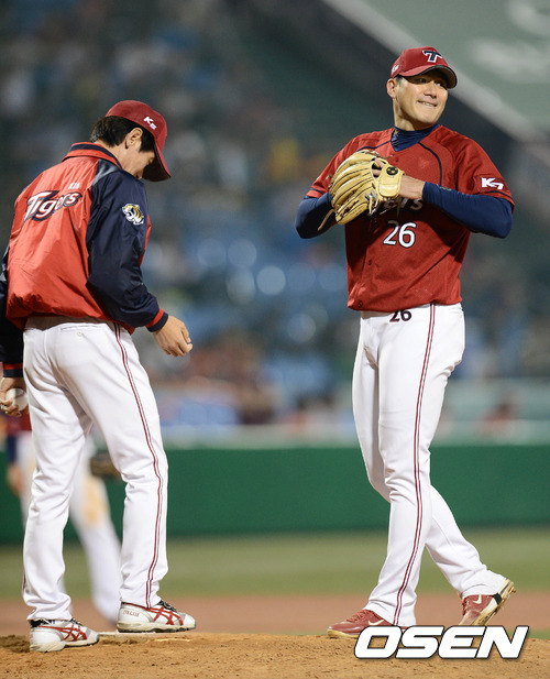 10일 오후 대전 한밭야구장에서 열린 '2012 팔도 프로야구' 한화 이글스와 KIA 타이거즈의 경기, 7말 무사 1,2루 한화 최승환 타석때 KIA 서재응이 마운드를 내려가고 있다. 서재응은 6이닝 무실점으로 내려갔다.