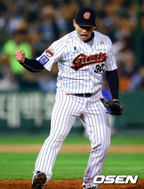 10일 오후 부산 사직구장에서 열린 2012 팔도 프로야구 롯데 자이언츠와 삼성 라이온즈의 경기 8회초 2사 1,2루 삼성 최형우의 타석때 롯데 최대성 투수가 삼진아웃 잡은 후 환호하고 있다