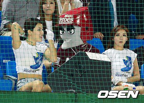 10일 오후 서울 목동구장에서 열린 '2012 팔도 프로야구' 넥센 히어로즈와 LG 트윈스의 경기에서 턱돌이가 치어리더 옆에 앉아서 말을 걸고 있다.
