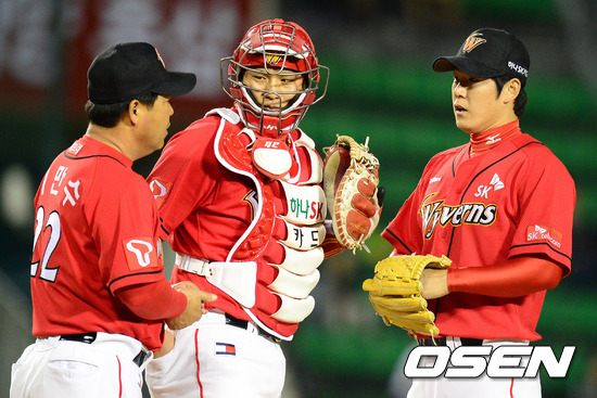 10일 오후 서울 잠실구장에서 열린 '2012 팔도 프로야구' 두산 베어스와 SK 와이번스의 경기, 8회말 SK 이만수가 1점차 추격을 허용하며 마운드를 내려오고 있다.