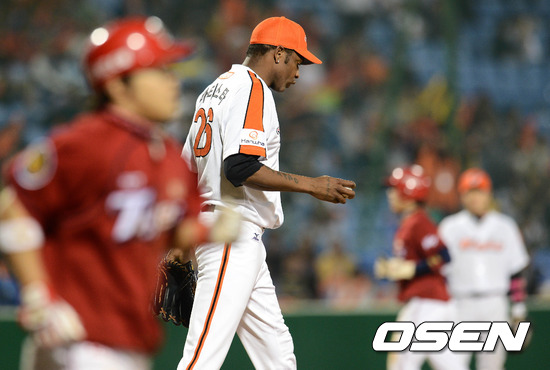 10일 오후 대전 한밭야구장에서 열린 '2012 팔도 프로야구' 한화 이글스와 KIA 타이거즈의 경기, 9회초 2사 1,2루 한화 바티스타가 KIA 김선빈에게 볼넷을 허용하며 만루 상황을 만들었다.