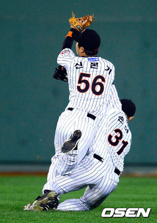 10일 오후 부산 사직구장에서 열린 2012 팔도 프로야구 롯데 자이언츠와 삼성 라이온즈의 경기 연장 11회초 2사 1,2루 삼성 조영훈의 외야플라이때 롯데 신본기 2루수와 손아섭 우익수가 충돌하고 있다. 타구는 손아섭의 외야플라이아웃.