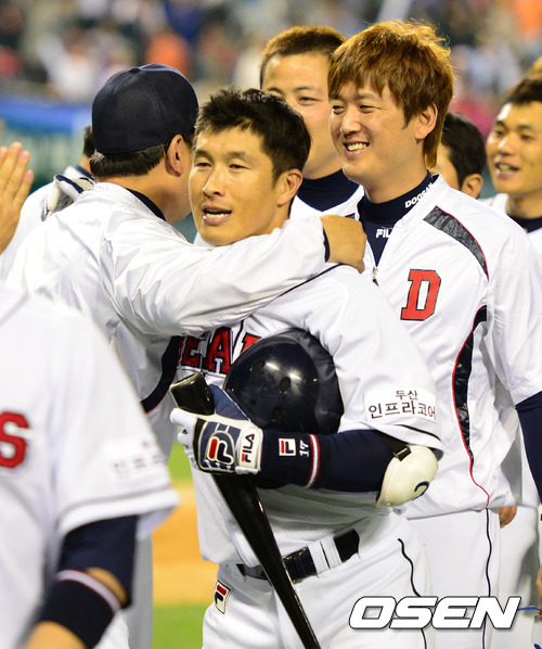끝내기 안타를 날린 두산 임재철이 이토 코치의 축하를 받고 있다./jpnews@osen.co.kr