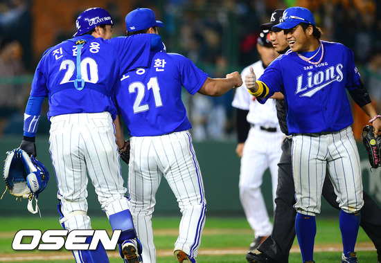 롯데 강민호의 외야플라이로 경기가 끝나자 오승환이 진갑용과 박석민과 함께 놀란 가슴을 쓸어내리고 있다./soul1014@osen.co.kr