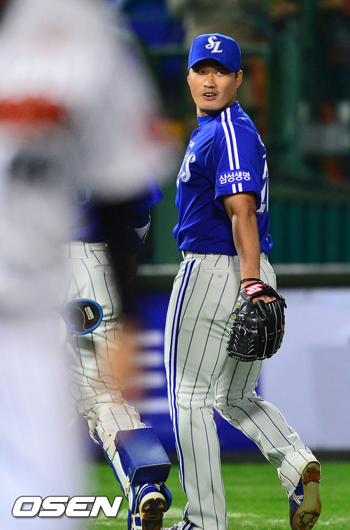 롯데 강민호의 외야플라이로 경기가 끝나자 오승환이 놀란 가슴을 쓸어내리고 있다./soul1014@osen.co.kr