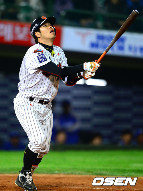12회말 2사 롯데 강민호가 외야플라이를 날린 후 타구를 바라보고 있다./soul1014@osen.co.kr