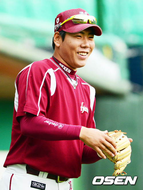 11일 오후 인천 문학구장에서 '2012 팔도 프로야구' SK 와이번스와 넥센 히어로즈와의 경기가 열릴 예정인 가운데 훈련시간에 넥센 강정호가 환하게 미소짓고 있다.