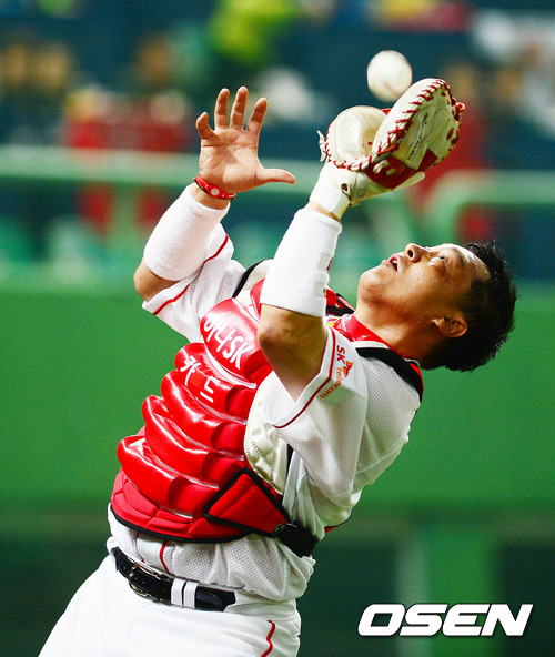 11일 오후 인천 문학구장에서 열린 '2012 팔도 프로야구' SK 와이번스와 넥센 히어로즈와의 경기 6회초 2사 주자 1,2루 SK 조인성 포수가 넥센 박병호의 플라이 타구를 달려가 잡아내고 있다.