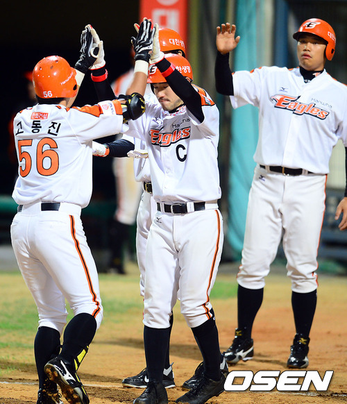 11일 오후 충북 청주구장에서 열린 2012 팔도 프로야구 한화 이글스와 롯데 자이언츠의 경기 5회말 2사 만루 한화 고동진이 만루 홈런을 날리고 동료들의 축하를 받고 있다
