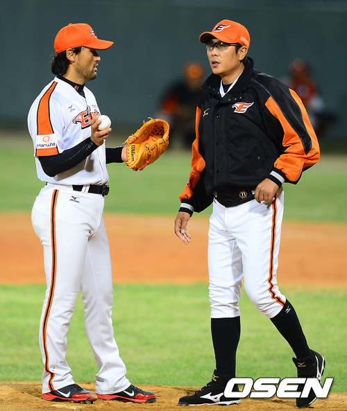 11일 오후 충북 청주구장에서 열린 2012 팔도 프로야구 한화 이글스와 롯데 자이언츠의 경기 5회초 한화 박찬호 선발투수가 정민철 코치에게 강판되고 있다