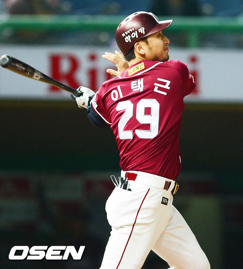 11일 오후 인천 문학구장에서 열린 '2012 팔도 프로야구' SK 와이번스와 넥센 히어로즈와의 경기 8회초 1사 주자 1,2루 넥센 이택근이 좌중간 2타점 적시타를 날리고 있다.