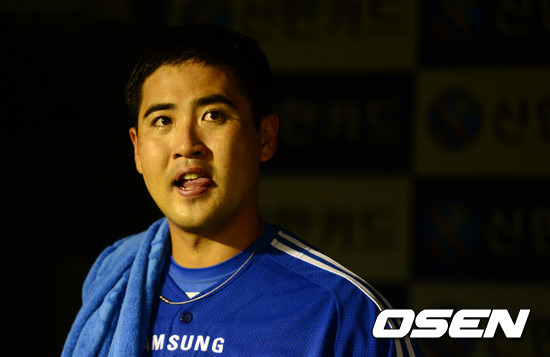 11일 오후 서울 잠실구장에서 열린 '2012 팔도 프로야구' LG 트윈스와 삼성 라이온즈의 경기, 7회말 마운드에서 내려온 삼성 장원삼이 더그아웃에서 경기를 지켜보고 있다.