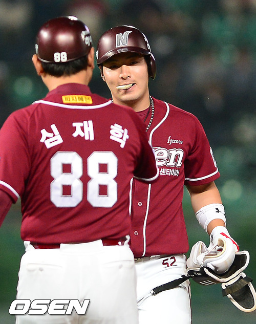 11일 오후 인천 문학구장에서 열린 '2012 팔도 프로야구' SK 와이번스와 넥센 히어로즈와의 경기 8회초 1사 주자 2루 넥센 박병호가 좌익수 왼쪽 1타점 적시타를 날린 후 심재학 코치와 2루에서 하이파이브를 하고 있다.
