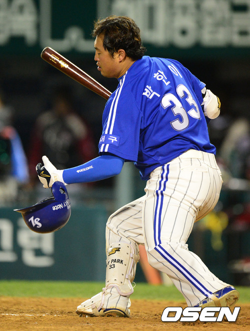 11일 오후 서울 잠실구장에서 열린 '2012 팔도 프로야구' LG 트윈스와 삼성 라이온즈의 경기, 8회초 1사 1,2루에서 삼성 박한이가 헬맷이 벗겨지며 헛스윙을 하고 있다.