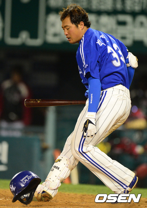 11일 오후 서울 잠실구장에서 열린 '2012 팔도 프로야구' LG 트윈스와 삼성 라이온즈의 경기, 8회초 1사 1,2루에서 삼성 박한이가 헬맷이 벗겨지며 헛스윙을 하고 있다.