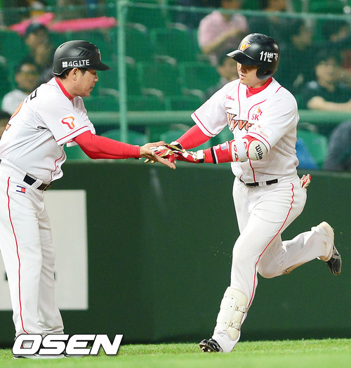 11일 오후 인천 문학구장에서 열린 '2012 팔도 프로야구' SK 와이번스와 넥센 히어로즈와의 경기 8회말 1사 주자 없는 상황에서 SK 최정이 좌월 솔로홈런을 날린 후 3루에서 이광근 코치와 하이파이브를 하고 있다.