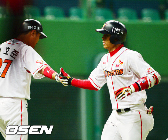 11일 오후 인천 문학구장에서 열린 '2012 팔도 프로야구' SK 와이번스와 넥센 히어로즈와의 경기 8회말 1사 주자 없는 상황에서 SK 최정이 좌월 솔로홈런을 날린 후 홈에서 이호준과 하이파이브를 하고 있다.