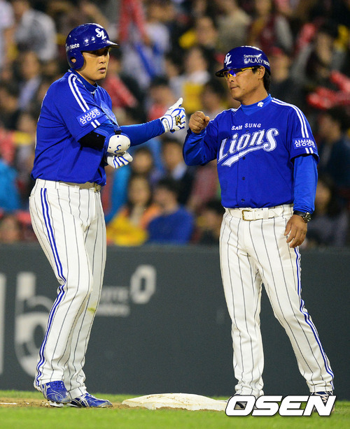 11일 오후 서울 잠실구장에서 열린 '2012 팔도 프로야구' LG 트윈스와 삼성 라이온즈의 경기, 8회초 2사 1,2루에서 삼성 이승엽이 1타점 적시타를 날리고 김태균 코치와 주먹을 맞대고 있다.