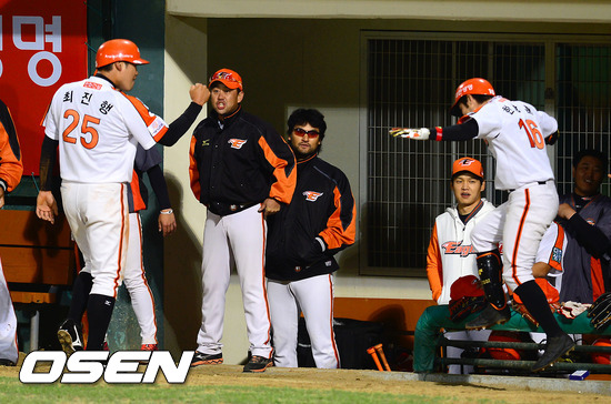 11일 오후 충북 청주구장에서 열린 2012 팔도 프로야구 한화 이글스와 롯데 자이언츠의 경기 7회말 2사 1,2루 한화 오선진의 1타점 적시타때 2루 주자 최진행이 역전 득점을 올렸다. 최진행이 동료들의 축하를 받고 있다