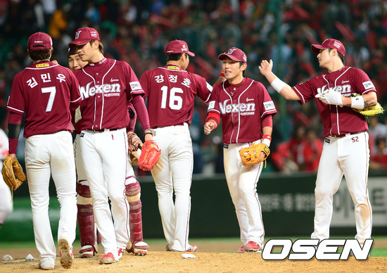 경기를 마치고 넥센 선수들이 마운드 근처에 모여서 기쁨을 나누고 있다. / rumi@osen.co.kr
