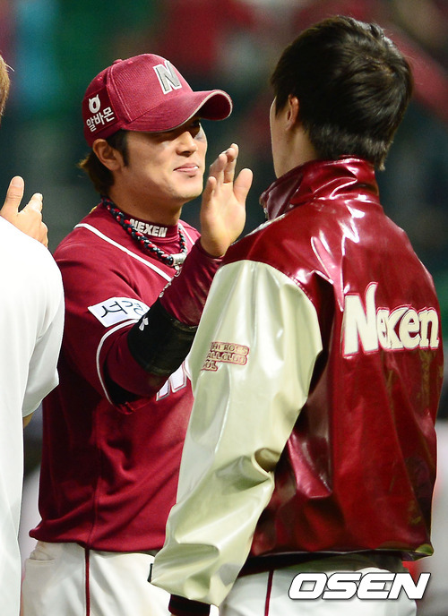 경기를 마치고 넥센 김민우가 동료들과 하이파이브를 하고 있다. / rumi@osen.co.kr