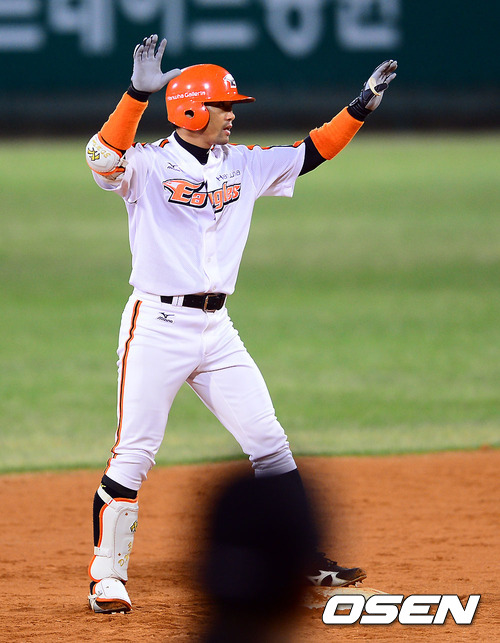 11일 오후 충북 청주구장에서 열린 2012 팔도 프로야구 한화 이글스와 롯데 자이언츠의 경기 7회말 2사 2,3루 한화 강동우가 2타점 적시타를 날리고 2루에 세이프되고 있다.