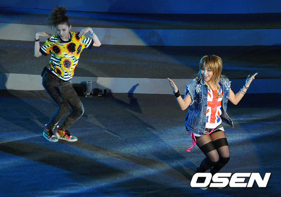 2012 여수세계박람회(EXPO 2012 YEOSU KOREA) 공식 개장을 하루 앞둔 11일 오후 전남 여수시 덕충동 엑스포 박람회장 빅오(Big-O) 광장에서 열린 개막식에서 그룹 투애니원 산다라박과 씨엘이 축하공연을 펼치고 있다.