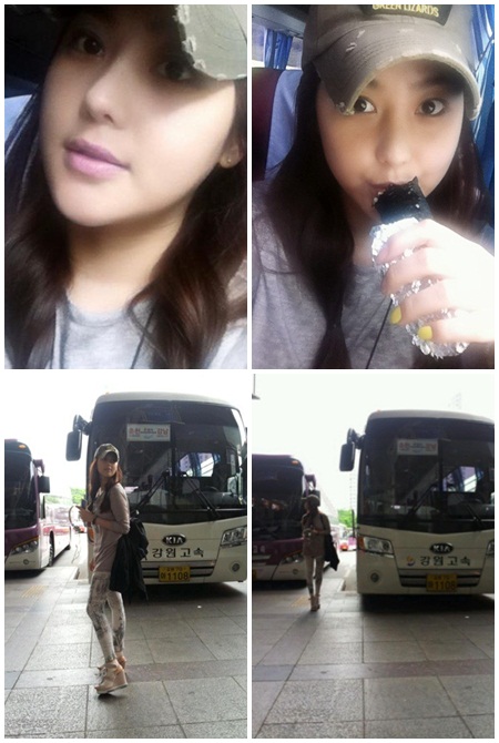 사진 속 솔비는 고속버스 안에서 김밥을 먹거나, 버스에 오르기 전 터미널 주변을 배회하는 모습으로 눈길을 끈다.
