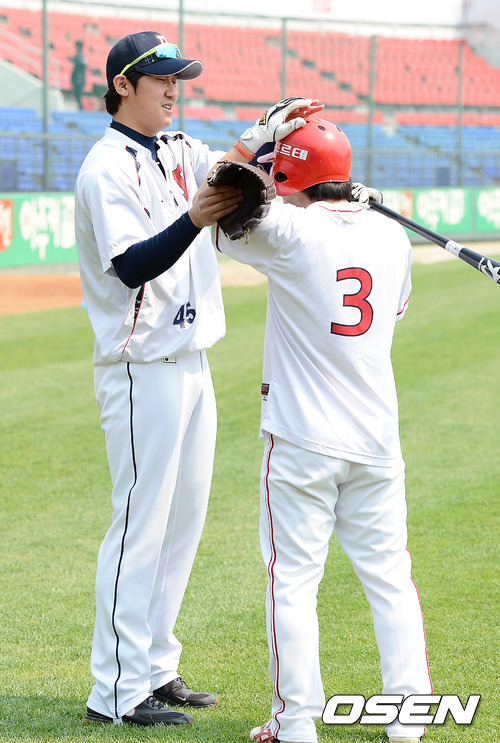 12일 오후 광주 무등야구장에서 열린 '2012 팔도 프로야구' KIA 타이거즈와 두산 베어스의 경기에 앞서 두산 이용찬이 KIA 김선빈과 장난을 치고 있다.