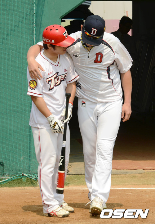 12일 오후 광주 무등야구장에서 열린 '2012 팔도 프로야구' KIA 타이거즈와 두산 베어스의 경기에 앞서 두산 이성열이 KIA 김선빈과 인사를 나누고 있다.