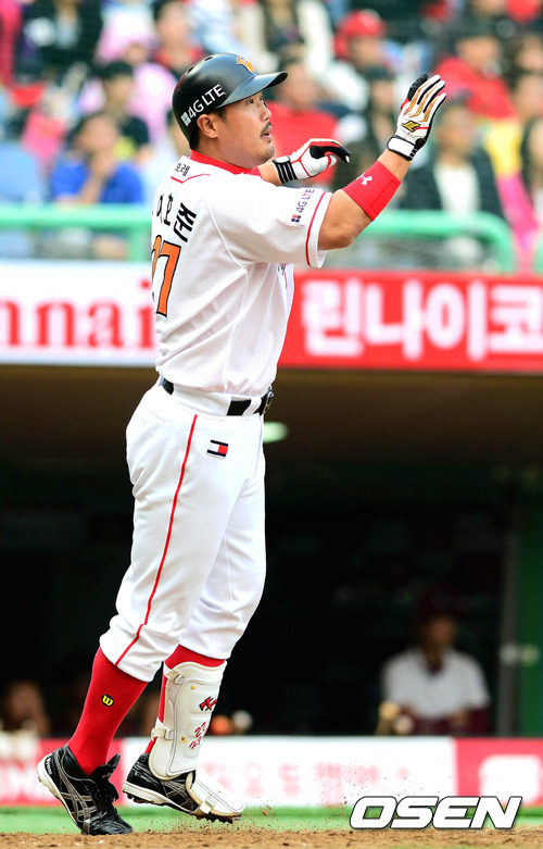 12일 인천 문학야구장에서 열린 '2012 팔도 프로야구' SK 와이번스와 넥센 히어로즈의 경기 3회말 2사 2루 이호준이 적시 2루타를 치고 타구를 바라보고 있다.