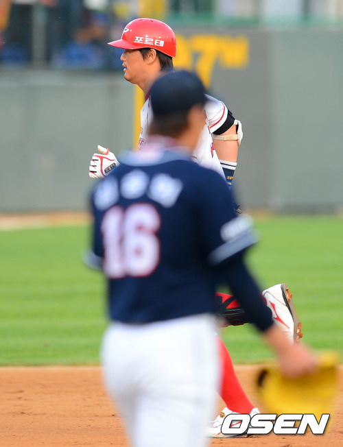 12일 오후 광주 무등야구장에서 열린 '2012 팔도 프로야구' KIA 타이거즈와 두산 베어스의 경기, 5회말 2사 만루 KIA 최희섭이 만루 홈런을 치고 그라운드를 돌고 있다.