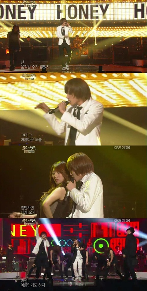 12일 오후 방송된 KBS 2TV '불후의 명곡-전설을 노래하다'(이하 불후)에는 프로듀서 박진영이 '전설'로 출연한 가운데, 틴탑이 박진영의 4집 타이틀곡 '허니'를 열창해 눈길을 끌었다.