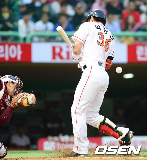 12일 인천 문학야구장에서 열린 '2012 팔도 프로야구' SK 와이번스와 넥센 히어로즈의 경기 6회말 2사 1,2루 박정권이 사구에 맞고 있다.