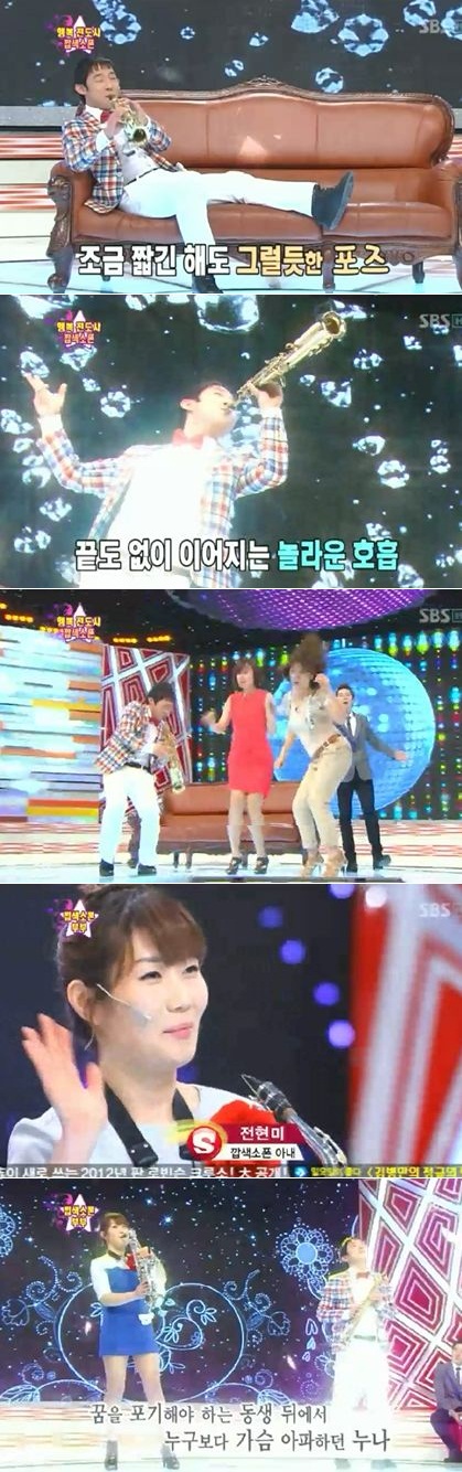 또 신 씨의 아내 전현미 씨도 중간에 무대에 올라 '이유 같지 않은 이유'를 연주하며 남편 못지않은 '깝색소폰' 실력을 과시했다.