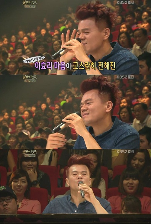 이날 박진영은 '또 한 번 사랑은 가고'에 얽힌 에피소드를 털어놨다. 그는 "이 노래는 이효리와 술을 먹다가 이효리의 얘기를 듣고 쓴 곡"이라며 "사랑에 상처 받은 이효리의 마음이 고스란히 전해졌다"며 당시를 회상했다.