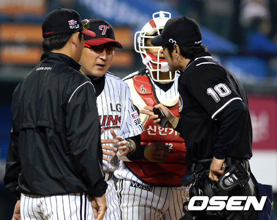 9회말 2사 만루 삼성 배영섭의 스윙이 파울로 판정되자 LG 김기태 감독이 나광남 구심에게 항의 하고 있다. / youngrae@osen.co.kr
