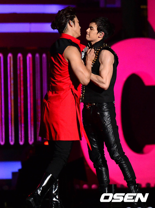 [OSEN = 백승철 기자] 12일 오후 서울 상암동 서울월드컵경기장에서 열린 '사랑한다 대한민국 2012 드림콘서트'에서 닉쿤과 택연이 공연중 싸우는 제스처의 안무를 보여주고 있다.
