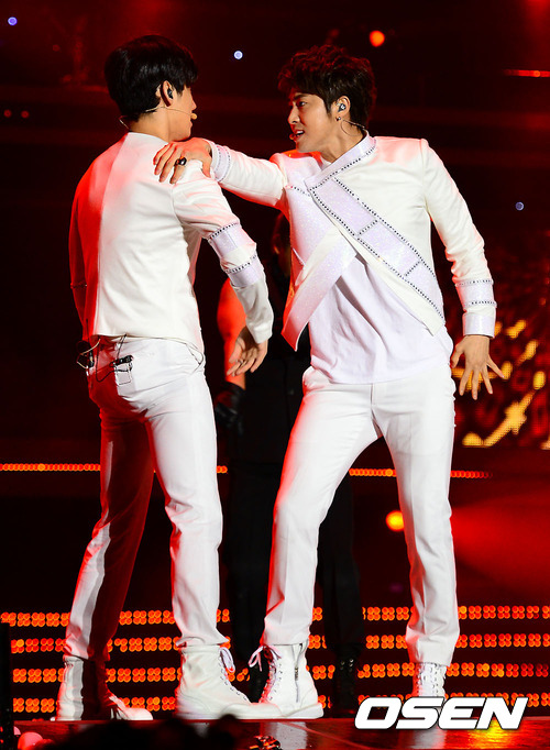 12일 오후 서울 상암동 서울월드컵경기장에서 열리는 '사랑한다 대한민국 2012 드림콘서트'에 가수 동방신기가 멋진 무대를 펼치고 있다.