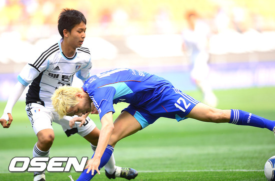 13일 오후 수원월드컵경기장에서 열린 연예인 축구팀 FC MEN과 수원 유스팀 매탄중와의 친선경기 후반 FC MEN 김준수가 공을 밟은 후 놓치고 있다.
