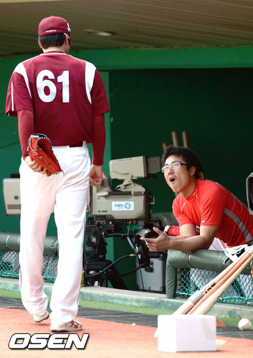 13일 오후 인천 문학야구장에서 열리는 '2012 팔도 프로야구' SK 와이번스와 넥센 히어로즈의 경기 전 SK 박정권과 넥센 유한준이 이야기를 나누고 있다.