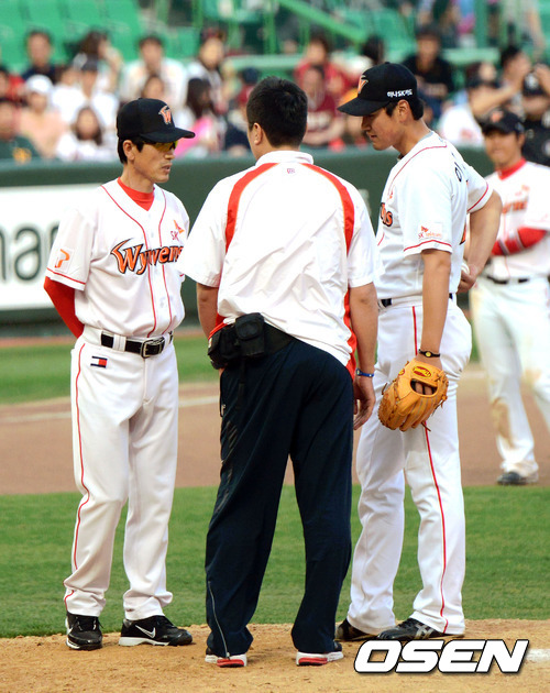13일 오후 인천 문학야구장에서 열린 '2012 팔도 프로야구' SK 와이번스와 넥센 히어로즈의 경기 6회초 2사 SK 이영욱이 허리통증으로 성준 코치가 마운드에 올라 이영욱과 이야기를 나누고 있다.