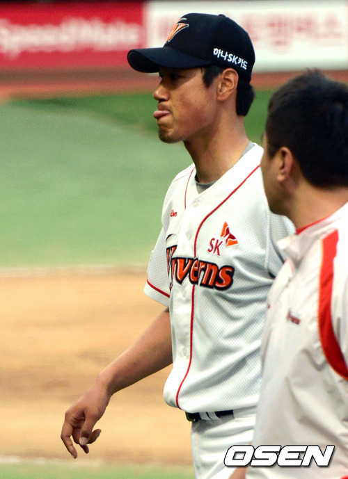 13일 오후 인천 문학야구장에서 열린 '2012 팔도 프로야구' SK 와이번스와 넥센 히어로즈의 경기 6회초 2사 SK 이영욱이 허리통증으로 강판되어 덕 아웃으로 들어오고 있다.