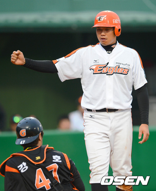 13일 오후 대전 한밭야구장에서 열린 '2012 팔도 프로야구' 한화 이글스와 롯데 자이언츠의 경기, 5회말 1사 2,3루 한화 이대수의 2타점 적시타때 홈을 밟은 2루주자 최진행이 세리머니를 하고 있다.