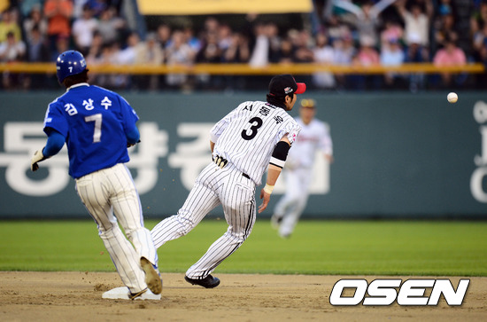 13일 오후 서울 잠실구장에서 열린 '2012 팔도 프로야구' LG 트윈스와 삼성 라이온즈의 경기 7회초 1사 1루 배영섭 내야땅볼때 LG 오지환 유격수 실책으로 1루 주자 김상수 2루에서 세이프 되고 있다.