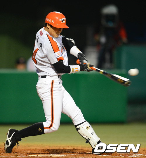 13일 오후 대전 한밭야구장에서 열린 '2012 팔도 프로야구' 한화 이글스와 롯데 자이언츠의 경기, 7회말 1사 만루 한화 이대수가 1타점 적시타를 치고 있다.
