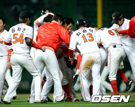 13일 오후 인천 문학야구장에서 열린 '2012 팔도 프로야구' SK 와이번스와 넥센 히어로즈의 경기 11회말 1사 1,2루 SK 임훈이 끝내기 안타를 치고 선수들에 둘러 쌓여 기뻐 하고 있다.
