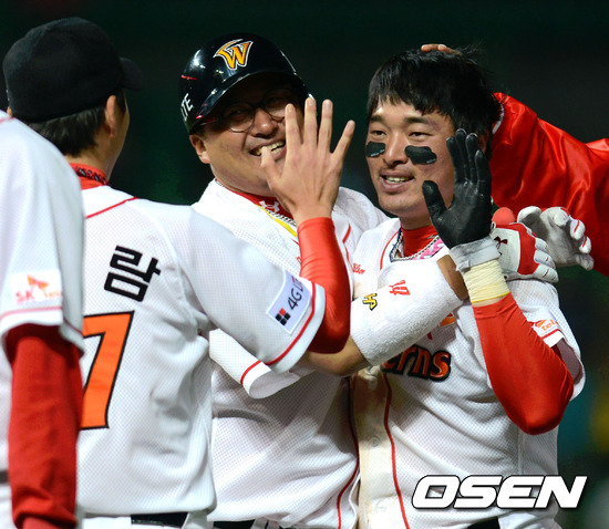 13일 오후 인천 문학야구장에서 열린 '2012 팔도 프로야구' SK 와이번스와 넥센 히어로즈의 경기 11회말 1사 1,2루 SK 임훈이 끝내기 안타를 치고 조인성, 정우람에게 축하를 받고 있다.