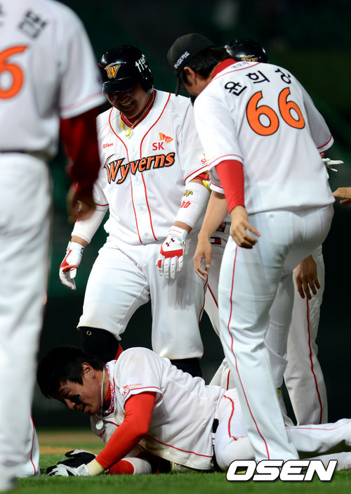 13일 오후 인천 문학야구장에서 열린 '2012 팔도 프로야구' SK 와이번스와 넥센 히어로즈의 경기 11회말 1사 1,2루 SK 임훈이 끝내기 안타를 치고 선수들에게 둘러 쌓여 기뻐 하고 있다.