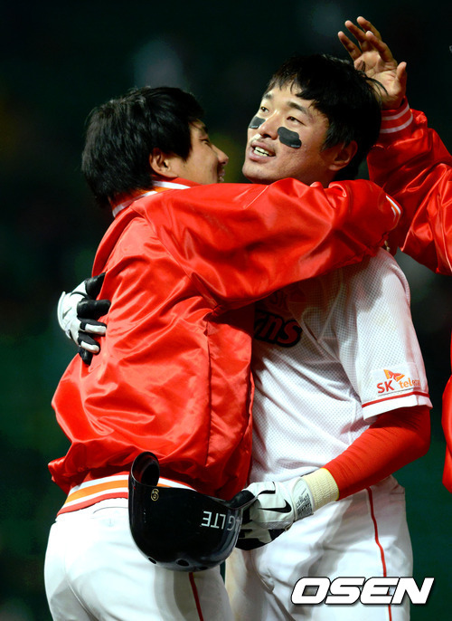 13일 오후 인천 문학야구장에서 열린 '2012 팔도 프로야구' SK 와이번스와 넥센 히어로즈의 경기 11회말 1사 1,2루 SK 임훈이 끝내기 안타를 치고 김강민과 포옹을 하고 있다.
